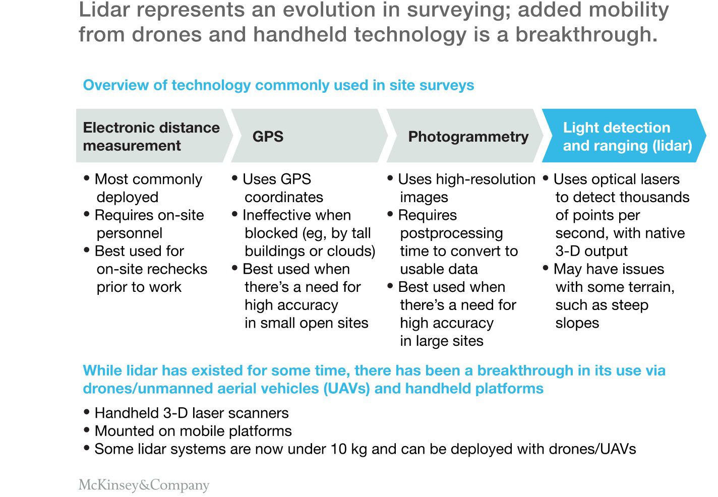 由於成本顯著下降,現代資訊技術越來越容易獲取。雷射雷達和即時動態 GPS 現在大約1萬美元;高解析度攝像機越來越小,也越來越輕;相比傳統直升機,工業無人機越來越快,也越來越便宜。目前也有專業公司協助進行無人機拍攝、資料獲取和資訊視覺化,一些政府機構和非政府組織也開始提供免費雷射雷達測距地圖。