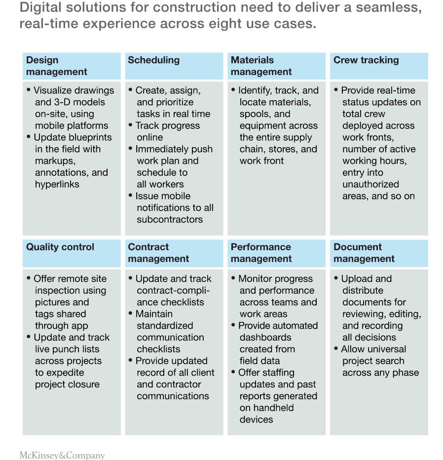 產業表現較為糟糕的一個原因是目前仍然依賴紙檔來管理專案,包括藍圖、設計圖紙、採購和供應鏈訂單、設備日誌、日進度報告以及竣工審核。由於缺乏數位化,資訊共用延遲司空見慣,業主和承包商使用不同版本的檔經常發生,這導致了變更和索賠。業主和承包商開始應用數位化協同和現場移動解決方案,見圖 7。一個國際施工企業最近宣佈,和軟體公司聯合開發一款基於雲端移動的現場監控平台,以開展大型工程專案計畫、設計、現場控制、預算和文件管理。幾個大的專案開發商已經成功進行專案管理工作流的數位化。