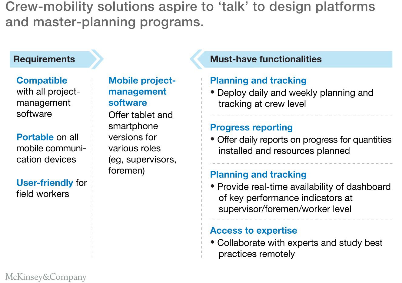 移動解決方案對效率提升產生了同樣的效果。長期以來,現場人員和辦公室人員即時溝通是一個大問題。但同時,以下因素限制了移動解決方案的應用,包括:不同移動解決方案的相容性問題、可靠度、高速寬頻和非直觀設計及使用者介面不友好等。低成本的移動連線費用已經導入了新一代「移動優先」的基於雲端的 APP 使用方式,即使在遙遠的施工現場,也能即時更新。目前,有 60% 的資金投入到了數位化協同和移動解決方案,如在平板和智慧手機上使用 APP,將施工藍圖和計畫的變化即時告知現場人員,現場圖片也能超級連結到專案計畫中。也有一些公司提供移動時間記錄、即時成本編碼、工人定位和問題日誌及追蹤。還可以實現變更管理、時間和材料追蹤,調度,生產效率測度和事故報告。