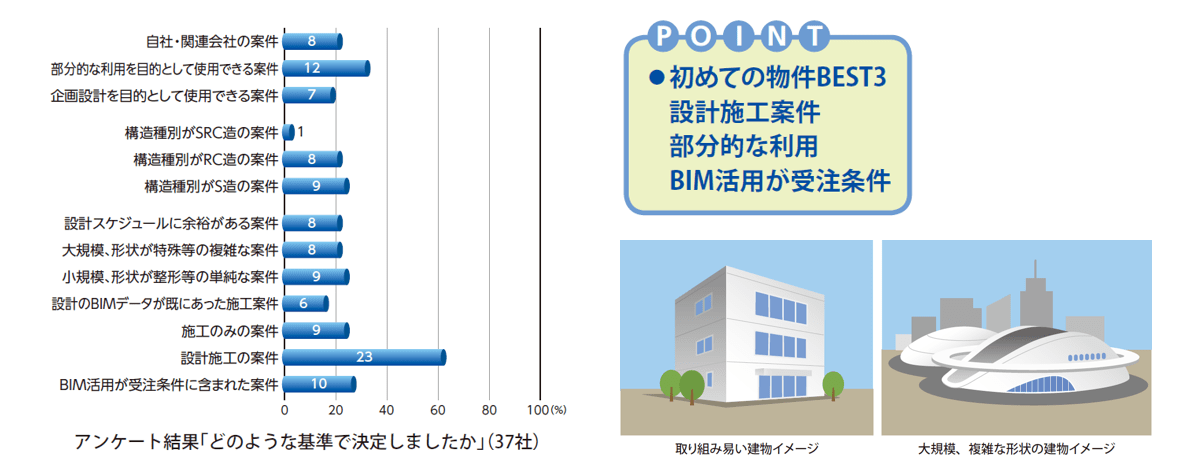 在萬事俱備之後,初期導入專案的選定也相當的重要,日本建設業連合会先是利用問卷調查的方式來了解以導入BIM技術的企業或團隊過去都以什麼樣的專案作為導入初期的專案標的,並得到了以下三種專案結果: