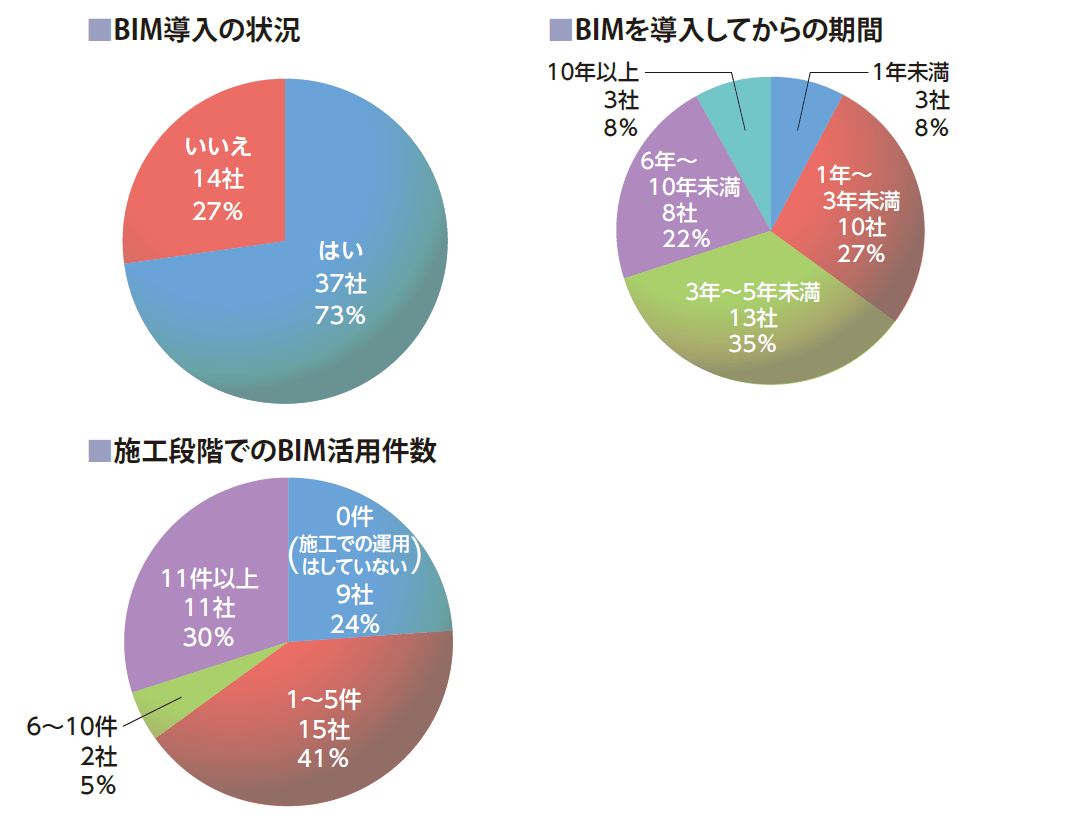 透過以上分析統計的圓餅圖,我們能夠發現,在日本,已導入BIM技術的建設相關企業已超過70%,導入未滿5年者則又佔其中的70%。在BIM技術實際應用於專案的施工階段上,已達10件專案者佔已導入BIM技術企業總數的70%,未在施工階段應用BIM技術者也佔了整體已導入BIM技術企業總數的1/4,約24%。