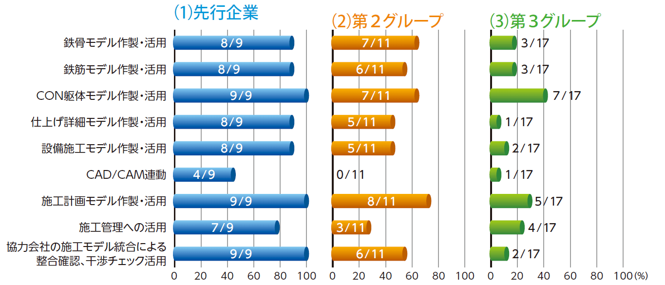 在施工階段BIM技術應用狀況的部分,透過統計結果,我們能夠了解在先行企業中,有超過80%的人已經正在從事除了「CAD/CAM連動」以外的技術應用。當然,每個企業組織在導入BIM技術時,皆有其主要導入應用的項目,但在第2組的分組中,各項技術應用的比例大約皆佔50%的比例,而在第3組的分組中,各項應用的比例皆下降至30%左右。