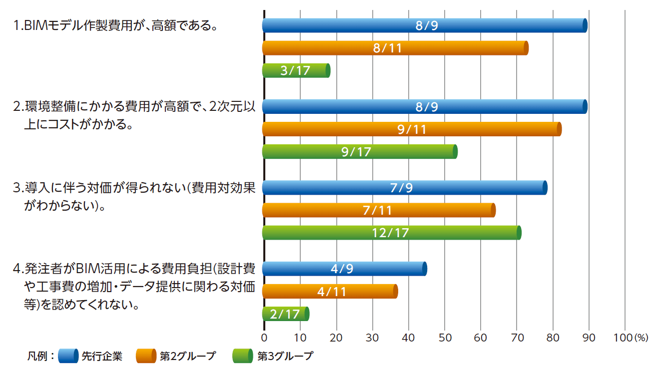 在企業組織導入BIM技術遭遇的阻礙,日本建設連合会將問題分為三個方向進行問卷訪查,分別是: