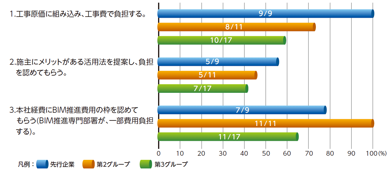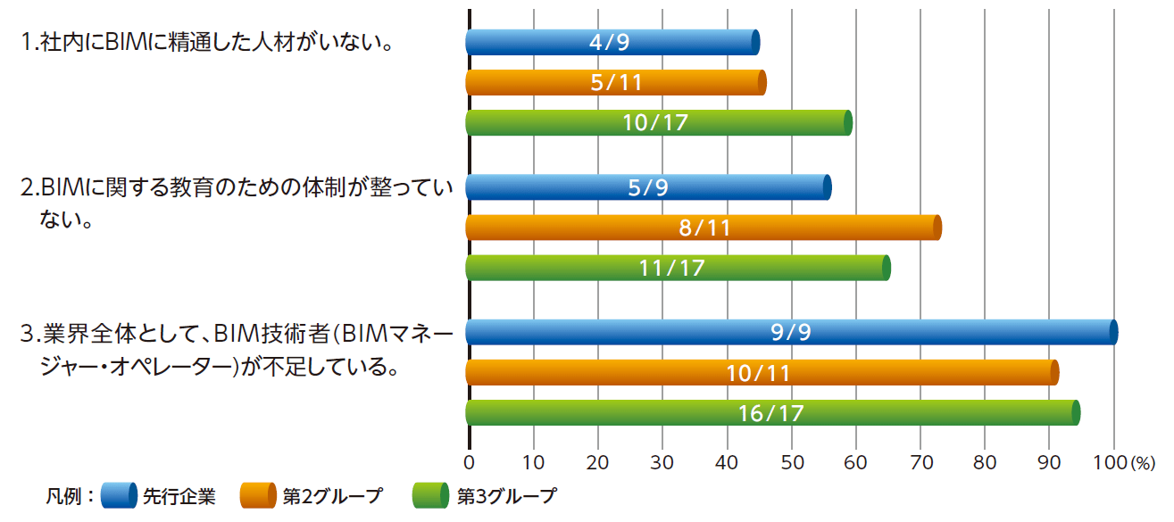 在分析整理問卷結果之後,在人才確保的問題上,我們能清楚發現先行企業對於「3.海外人才活用」的項目有高達55%的比例,但是在第2分組與第3分組企業中,這個選項的勾選率卻是相當低的。在其他選項中,包含公司內、外部的培訓、將BIM技術需求外包給可信賴的顧問公司或相關事務所等,先行企業也都有高達90%的比例,而第2與第3分組企業則大約處於70%的比例。
