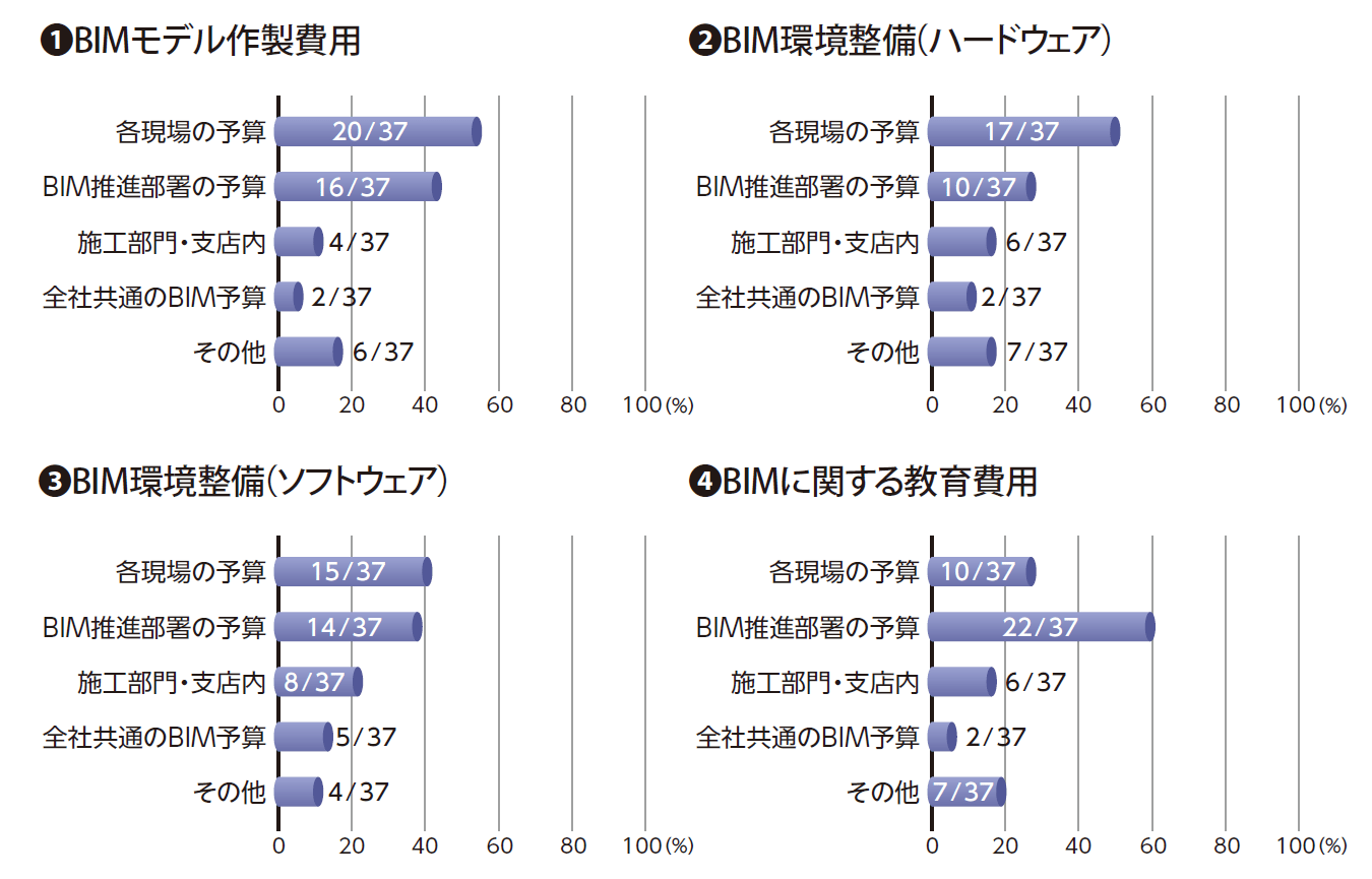 在進行BIM技術導入企業組織的過程中,必然會有成本開銷的發生,在這個部分,日本建設連合会也將愈其發生的成本分為四個部分進行問卷訪查,藉此了解已導入BIM技術的企業組織是如何進行預算的編列,提供有意導入BIM技術的企業組織作為財務預算編列上的參考。四個部分分別為:BIM模型製作費用、BIM環境建立(硬體設備)、BIM環境建立(軟體設備)以及BIM相關教育訓練費用,其調查結果整理分析如下:
