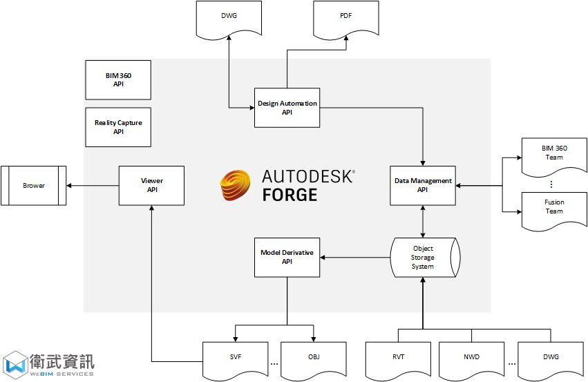 其中模型瀏覽API則提供了網頁中瀏覽、檢視、協作多種二維(2D) 或三維(3D)的模型的功能,並開放豐富的應用介面(API),讓開發者依照特定使用需求自行擴充應用,許多模型操作的客製化應用多是透過此API進行,而模型資料截取及轉檔API負責多種格式的模型資料、清單文件的轉檔和資料萃取功能,想要透過模型瀏覽API呈現的模型必須先透過此API進行轉檔,方能於網頁中讀取模型,另外資料管理API統一了模型資料的存取模式,讓開發者取得及操作A360, Fusion 360, BIM 360等外部資料和底層資料存儲服務(Object Storage Service),在模型轉檔之前,必須先透過此API將模型上傳至此處。最後AutoCAD雲端自動化API則提供了產生或編輯AutoCAD DWG 圖紙的功能。