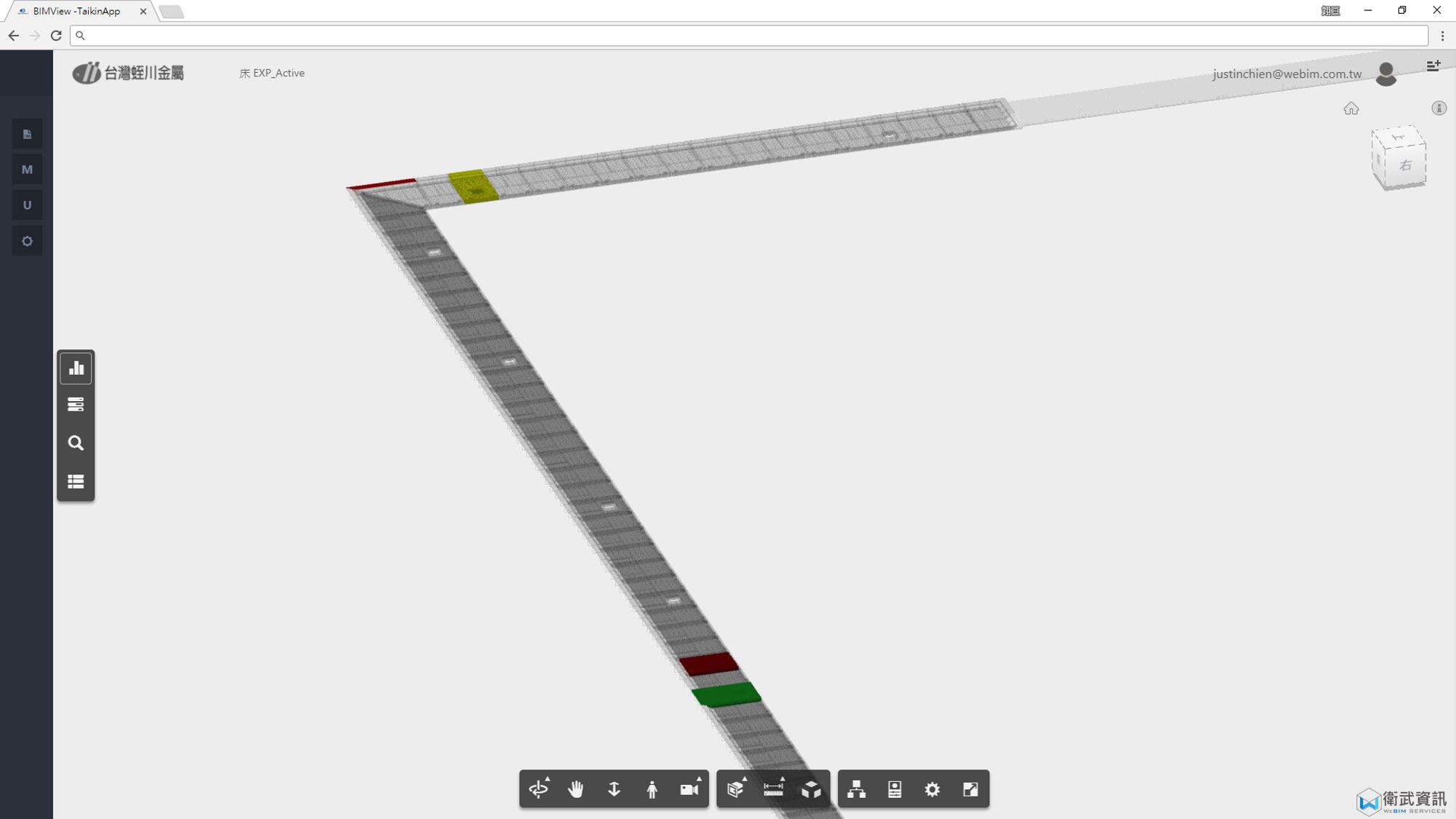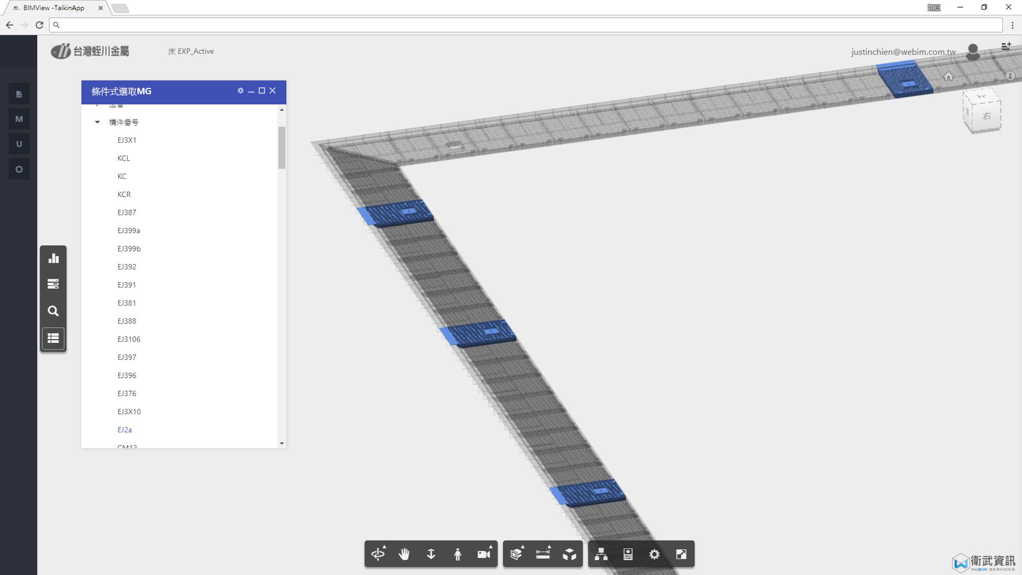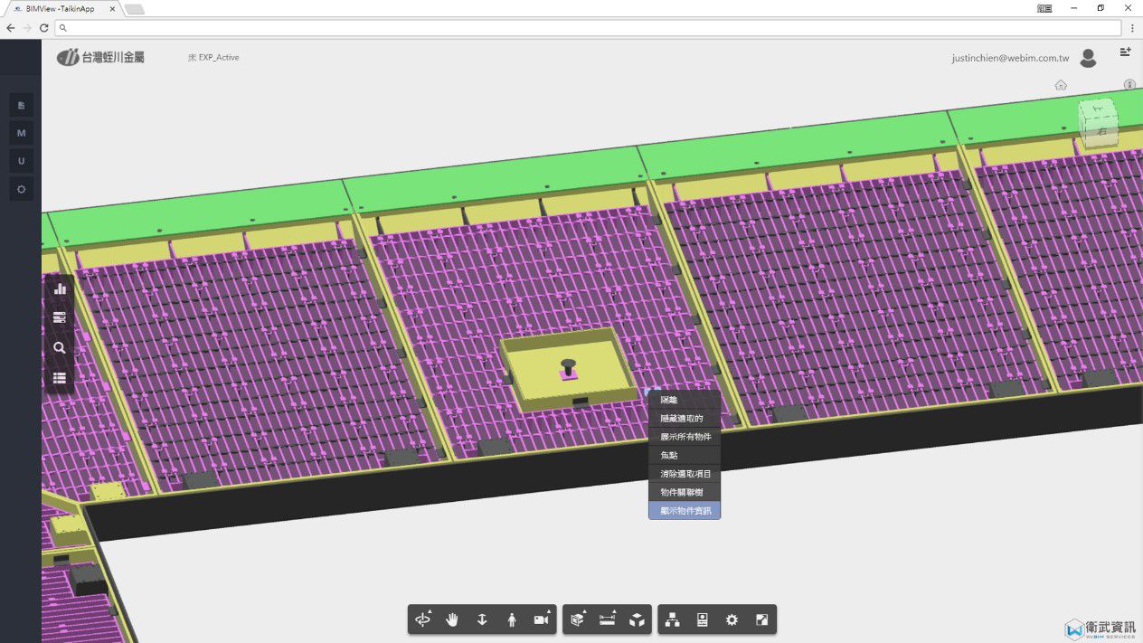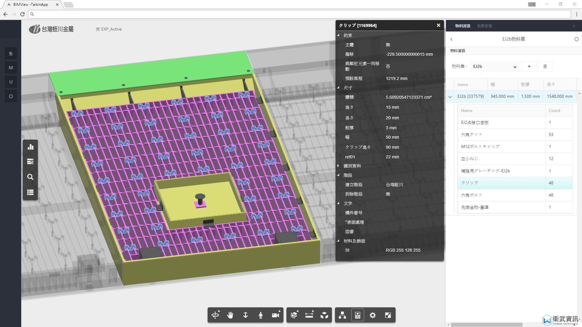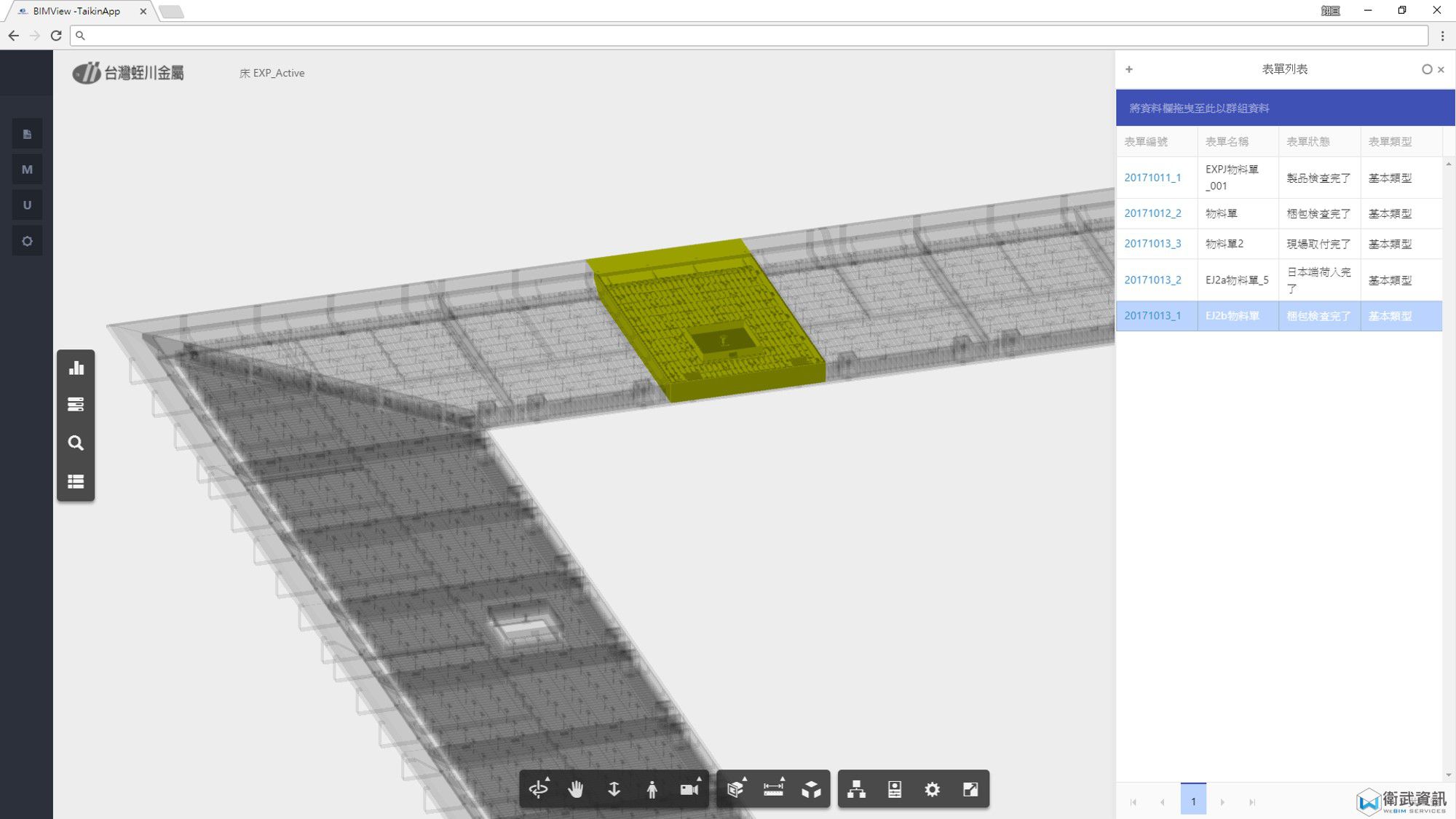 為了解決上述困難,WeBIM替台灣蛭川金屬開發了一套物料管理系統,其中應用Forge技術實現網頁中操作和瀏覽3D模型的功能,並配合客製化開發功能模組管理物料狀態與物料數量統計,以利使用者能快速掌握物料安裝位置和相關資訊,業主也能藉由3D模型中的狀態顯示功能了解物料的運送狀況。