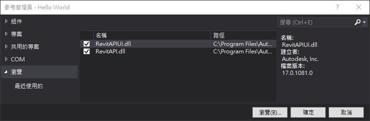 參考管理員的視窗就會出現,在視窗左邊的瀏覽頁籤中,按下右下角瀏覽的按鈕,並找到RevitAPI參考檔。參考檔的位置就在Revit安裝資料夾中,選擇RevitAPI.dll與RevitAPIUI.dll後,並按下確定。接下來就可以看到兩個參考檔出現在參考管理員的視窗中(如下圖八所示),按下確定就完成把參考檔加入程式步驟了。
