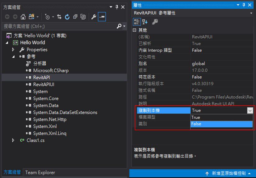 在這邊我們需要幫專案參考做一下設定來節省硬碟空間,點選我們剛剛加入的參考檔,也就是RevitAPI.dll與RevitAPIUI.dll。然後在屬性的視窗中把複製到本機的選項改成False(如下圖九所示)。這樣在建置API程式時,程式就會去找Revit本體中的參考檔,而不會產生一些額外的參考檔到API程式的資料夾中。