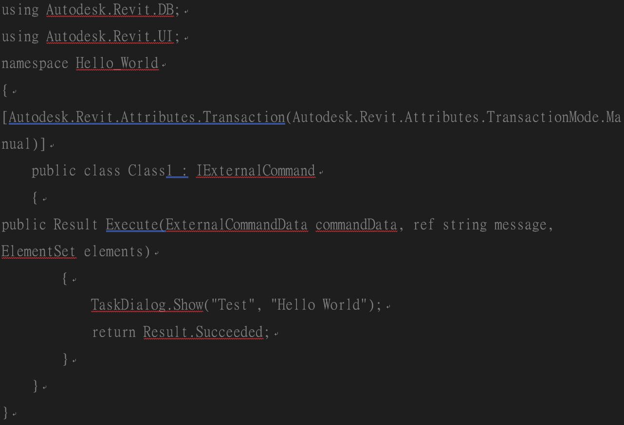 接下來就是寫程式的時間了,這次的程式非常的基礎。是大家的可以輕鬆完成的Hello World。不過,是用Revit API的環境來寫。所以,在程式碼中我們還需要加上一些設定。讓我們一步一步來:
