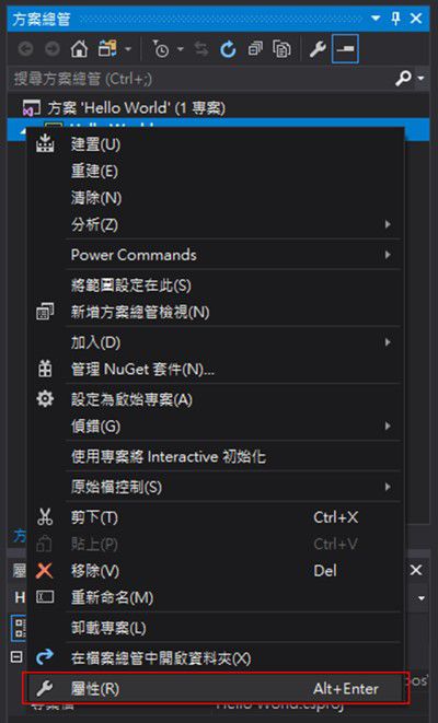 1. 於方案總管中的專案上點選右鍵(如下圖十所示),並選屬性(R)。