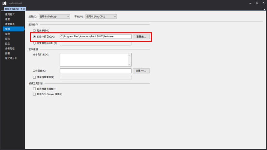 2. 於左側的頁籤中選擇偵錯,並於起始動作的區域點選啟動外部程式後按下瀏覽(如下圖十一所示)。
