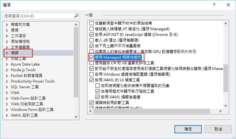 5. 於選項視窗的右側列表中,點選偵錯,並於左側的選單中找到使用Managed相容性模式,把該選項勾選(如下圖十二所示),並按下確定。