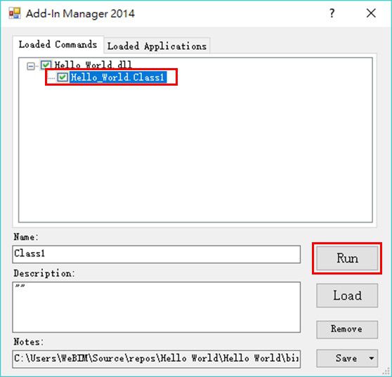 這時Add-in Manager就會載入我們的Hello World專案,點選專案下的Class並按下Run(如下圖十三所示)。