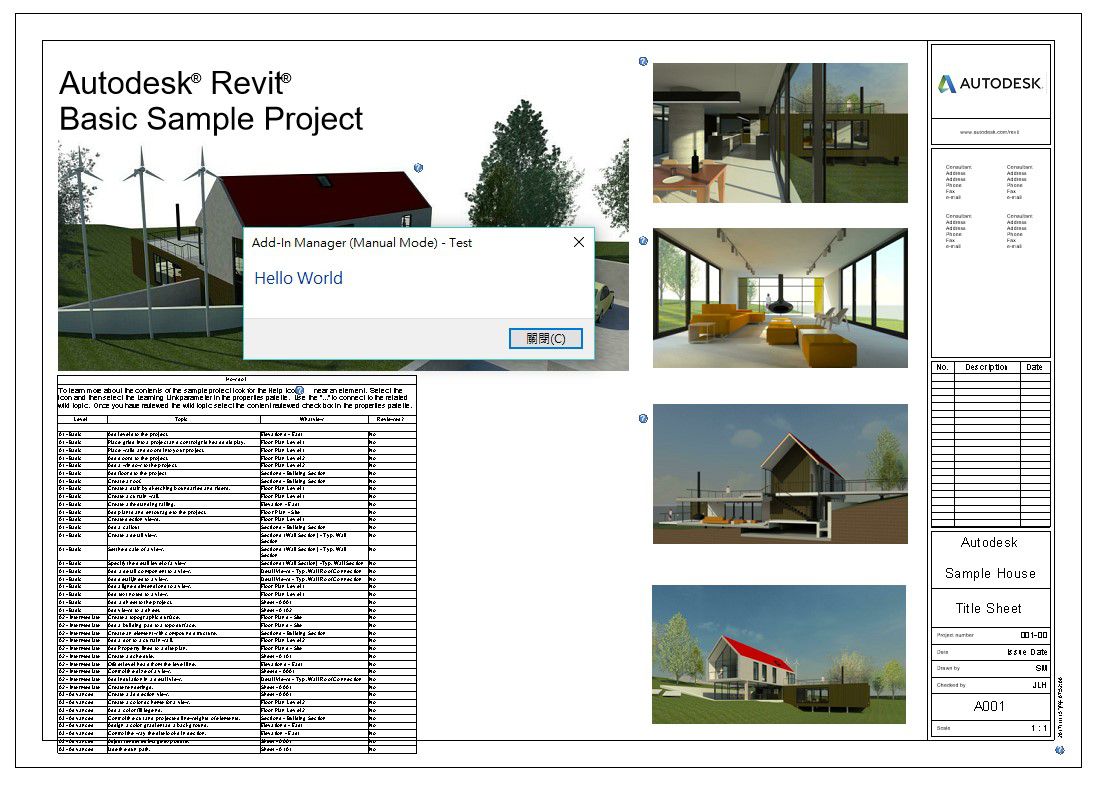 這樣就可以成功的偵錯專案了。接下來讓我們來使用Add-in Manager執行我們的Hello World外掛吧。進入Revit專案後,點選增益集並點選外部工具的Add-In Manager(Manual Mode)。接著於Add-In Manager的視窗中點選Load的按鈕,並選擇我們編譯的Hello World專案的偵錯.dll檔,其路徑如下(~\ClassLibrary1\ClassLibrary1\bin\Debug\ClassLibrary1.dll)。並按下開啟。