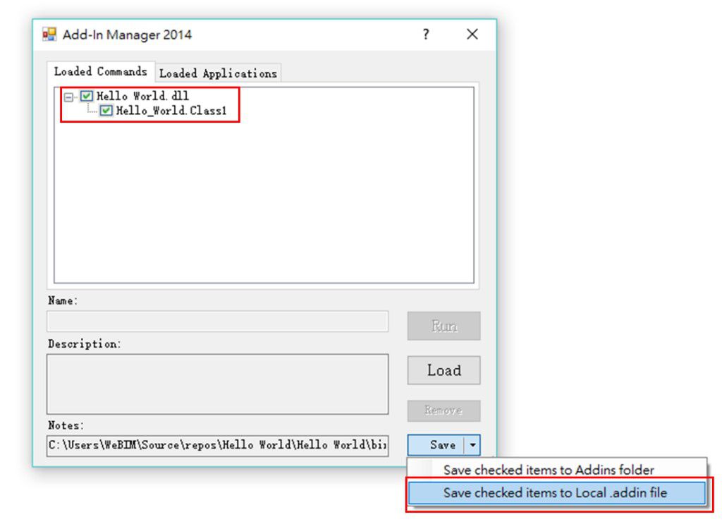 不過,如果我們的API程式只能透過Add-in Manager執行的話,那也太不像一支正常的程式了。所以讓我們來在Revit中部屬Hello World吧,首先先來製作Hello World的addin檔。一樣開啟Add-in Manager後,只勾選我們的Hello World的dll檔,接著按下右下Save鍵。按鍵就會出現下拉式選單,點選第二個Save checked items to Local .addin file(如下圖十五所示)。