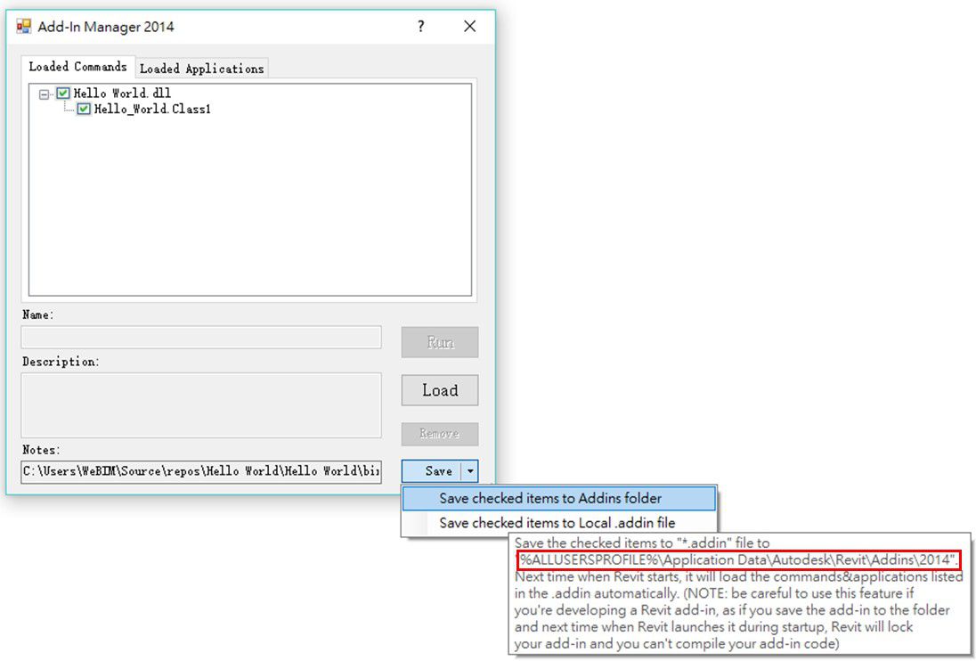 接下來的步驟就與本文一開始部署Add-in Manager的addin一樣,把 Hello World的addin用文字編輯器打開,將Assembly處的文字改為Hello World dll檔於本機電腦中的實體位置就可以儲存。接下來把addin檔放到C:\ProgramData\Autodesk\Revit\Addins\Revit\中對應版本的資料夾中,我們就完成了Hello World的.addin部屬了。