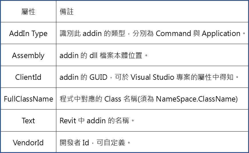 當Revit讀取addin時,Revit會了解到他現在需要加入這個外掛。addin本身包含了外掛程式的XML格式相關資訊,例如:程式的名稱、程式的類型、程式(.dll)的實體位置、程式的GUID、程式裡面的函式名稱等等的資訊。以下將用表格方式介紹。