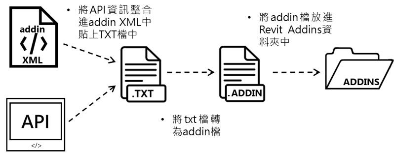 現在回到我們剛剛提到的在沒有Add-in Manager的幫助,我們需要自行製作addin的問題。自行製作addin相當的麻煩,我們首先要把上面提到的程式碼複製貼上一個文字檔中,再來依據我們Revit API程式的資訊更改Xml中內部的各項屬性資料。完成後將文字檔更改副檔名為addin,即完成了Revit API程式的addin製作。自行製作完addin後,還要再把addin部屬到Revit Addins資料夾中對應的版本資料夾,才可以進行測試,以上整個操作流程的示意圖如圖二所示。