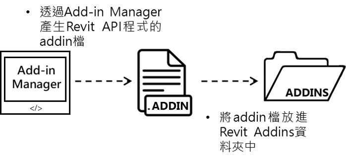 而若是addin中的API資料有錯誤,Revit就無法載入Revit API程式已進行測試。來來回回的檢查與開啟Revit相當的繁複,很容易浪費我們寶貴的時間。所以我們才需要Add-in Manager來幫助我們開發Revit API程式。Add-in Manager提供我們快速執行我們API程式的服務,而不需事先部署addin,也可以幫我們快速產生我們的API程式的addin等方便的功能。因此我們只要等到程式完成開發後來進行部屬,而不須在程式開發過程中進行部屬。在有Add-in Manager的幫助下進行部屬得流程大致如下: