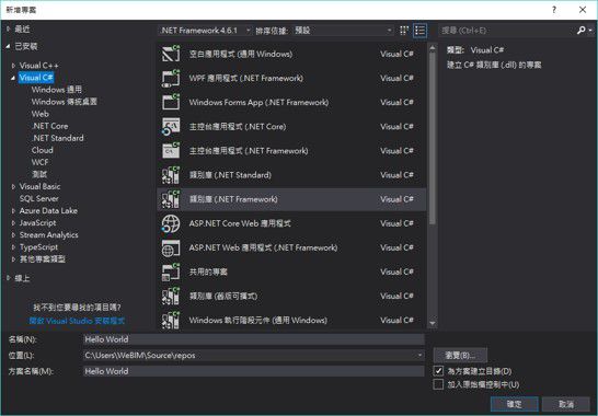 第一步我們先把程式的環境設定好。開啟Visual Studio建立一個新專案。這邊我們的專案類型要選擇類別庫(如下圖六所示),接著把專案名稱改為Hello World,並按下確定後,就成功建一個新的類別庫專案了。
