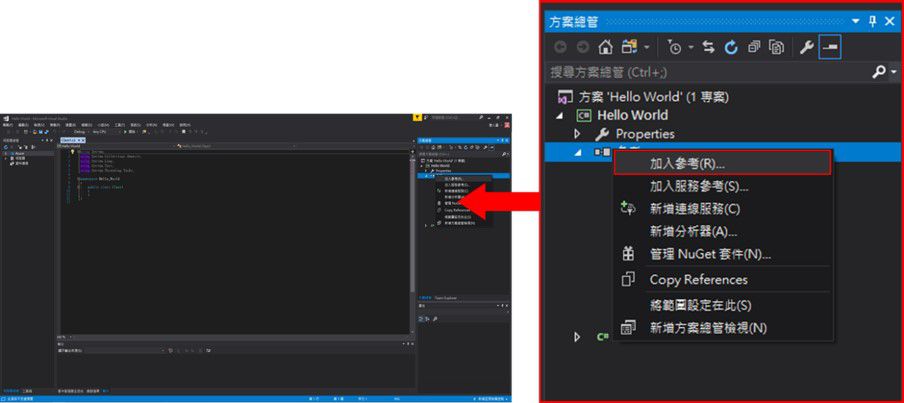 那麼接下來我們要來把這個專案變成RevitAPI外掛程式。首先,在方案總管的參考中點選右鍵,並選擇加入參考(如下圖七所示)。