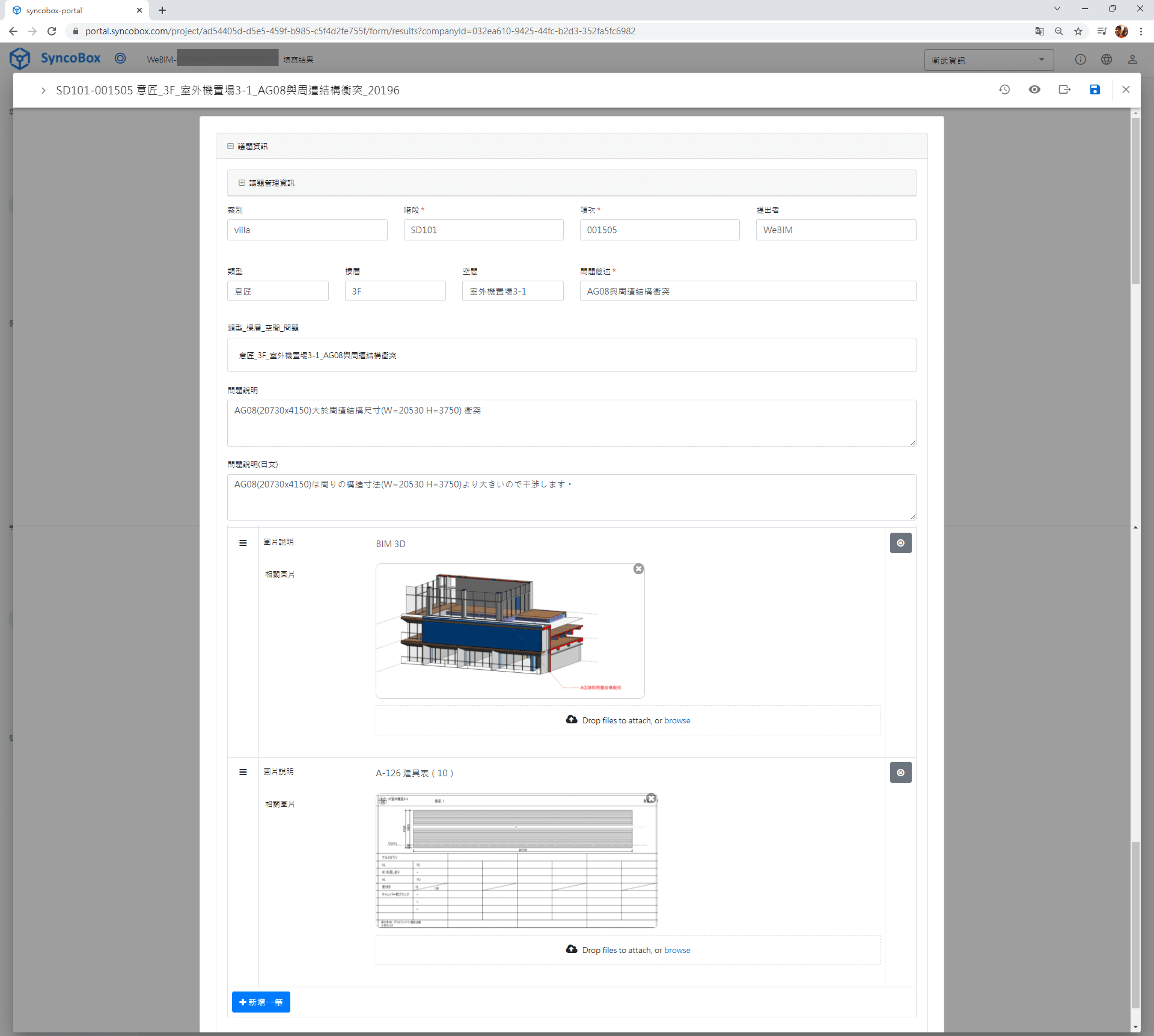 此外,配合衛武資訊開發的API,還可以將Revit 3D視圖,大量批次導入SyncoBox直接做成「議題單」,後續僅需要再次針對議題單,依需求做詳細的資訊輸入與描述,例如議題的樓層位置、內容、2D圖說截圖…等等,這樣的流程大幅縮短議題整理的時間,將力氣專注於問題本身。