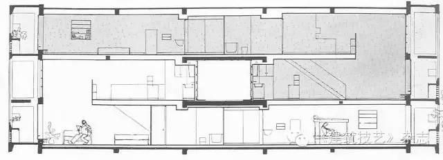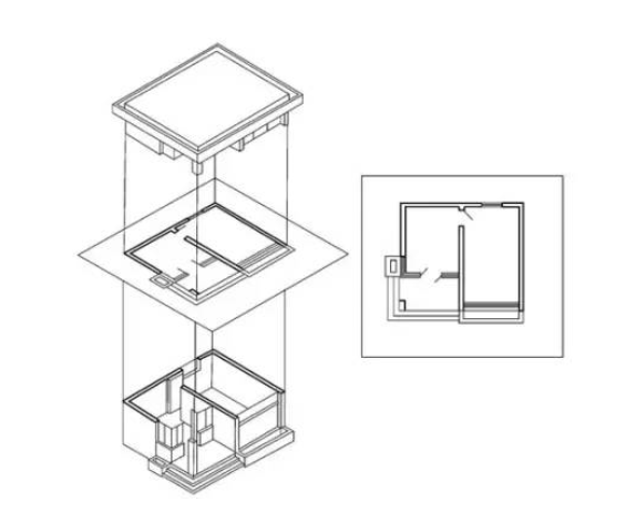 上述問題都出在不同投影介面之間的關係上,但即便回到單一的剖切-投影介面中,我們仍然能看到類似的問題 — 這一問題恰是由剖切引起的。如前文所分析的,剖切的妙處在於它為建築師呈現了某些在平常的視覺體驗中無法呈現的關係,但在呈現之前,我們首先要對空間實施剖切,而剖切的位置不同,其所反映的關係可能也存在極大的差異 — 理論上,一張剖切圖只能闡釋空間中極窄、極薄的區段內的關係。需要特別指出的是,這並不是增加幾個剖切位置就能解決的問題:通過剖切反映既有空間的關係,與在選定的剖切介面上執行設計完全是兩回事。對於設計操作而言,一旦剖切位置以及由剖切所確定的初始關係被事先確定下來,建築師評估和推敲這些關係的思維層面也被鎖定了 — 因此,與其說建築師是在通過剖切圖來設計空間,不如說是在設計那張剖切圖本身。在這樣的設計介面中,被剖到的關係無疑能獲得精確和透徹的解決,但如果建築師企圖將這些解決貫徹於整個空間,那麼他就必須用這幅剖切圖來規範與剖切位置相連續的其他空間關係,並通過沿著垂直於剖切面的方向拉伸來生成空間(圖 14)。事實上,許多建築師是通過同化空間的生成方式來確立剖切圖的「代表性」的,而不盡如我們通常認為的,選擇有代表性的剖切位置來解決空間問題 — 這是宿命。