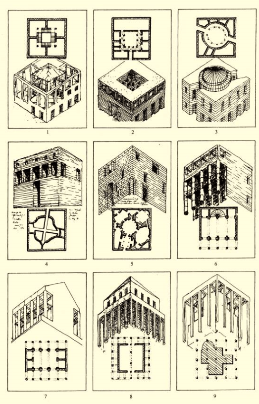 繪圖術之為「術」,不僅是製圖與表達的「技術」,從某種意義上更是決定設計方法的「學術」。基於不同繪圖術所執行的建築設計,所獲得的形式類型也必然不同。比如,文藝復興的建築群及單體內部閃出那條通敞的視廊軸線,是通過由連續透視線來實現空間表達的科學透視法推敲設計的必然結果,以透視法為起點是不可能獲得以影壁開始序列的中式庭院或放置屏風的中式空間的(圖 7、8)。