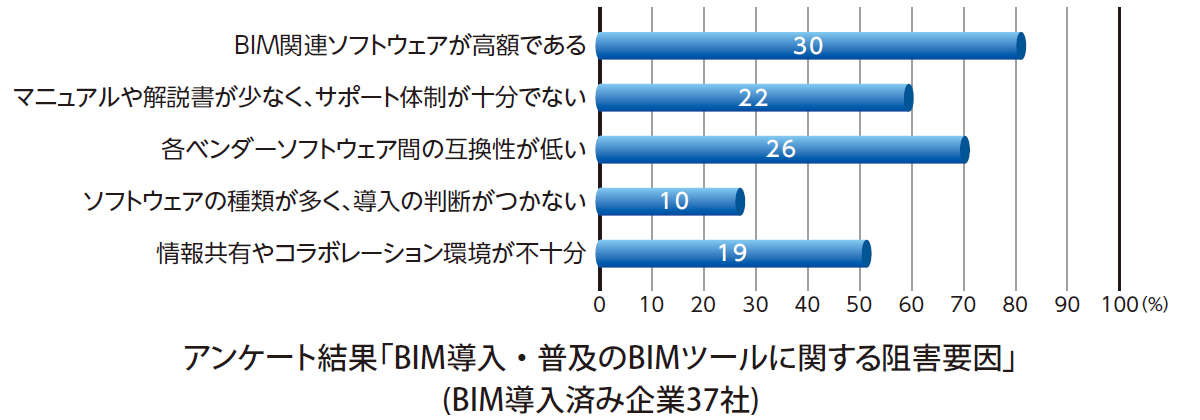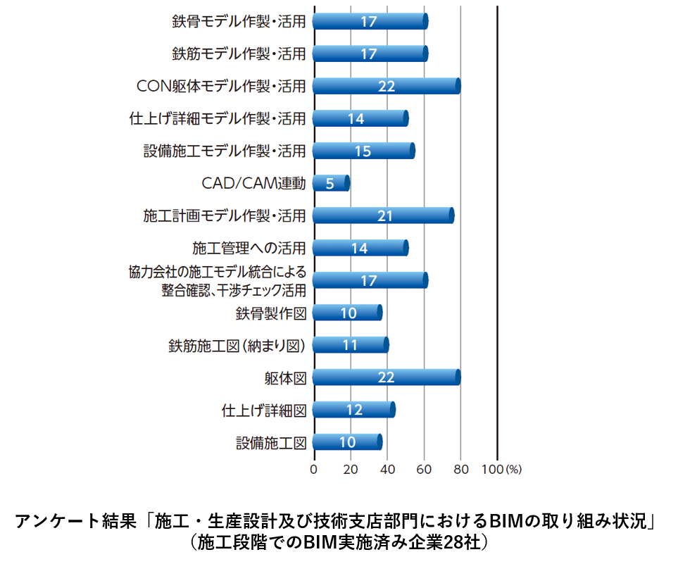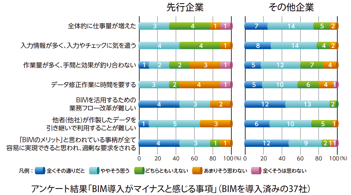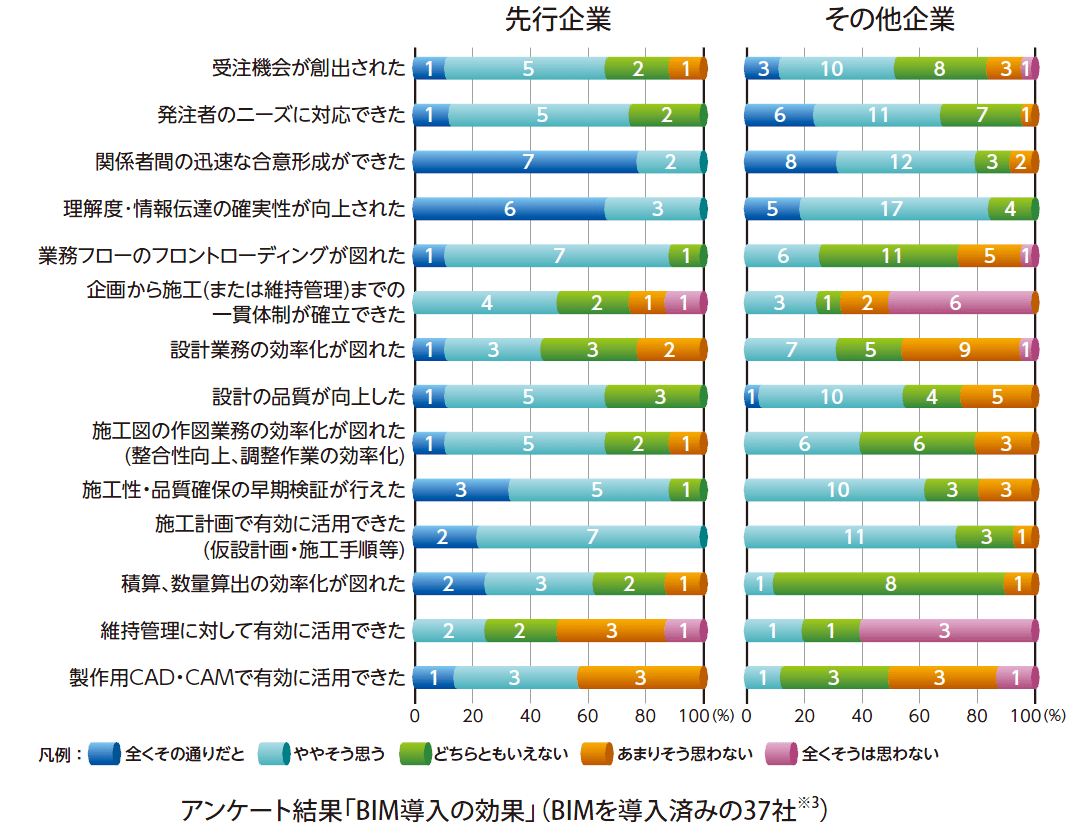 期望擴展BIM技術發展,首先應該先通盤了解BIM技術的可行性,究竟有那些工作是透過BIM技術能夠提升成效,那些則是無法達到的呢?日本建設業連合会在這一小節給了針對已導入BIM技術6年以上並有10件以上施工專案經驗的相關企業以及非前述背景之相關企業進行問券訪查,透過問卷分析結果得知,在設計、施工的概念與資訊傳遞以及工程施作規劃方面,確實能透過BIM技術獲得成效,而在數量計算方面則是普遍感覺較為困難的課題。