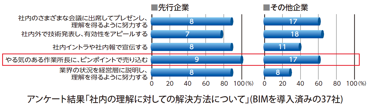 在施工階段,文章前段建議率先針對施工所的所長做為導入對象,在這邊則進一步針對遭遇組織內部理解問題時,建議除了普遍針對施工所的所長之外,對於有主動意願及企圖接受BIM技術者,更應列為優先中的優先對象。此外,在宣導傳遞BIM技術的優勢的同時,BIM技術的劣勢也應該一併說明,避免遭遇問題時,與想像中的產生過大的落差,反而造成反效果,加深導入的阻礙。最後則是在要求他人認同與理解之前,自己應先充分理解企業組織內部可實行的內容、可能發生的成本、作業時間以及可能增加的作業負擔等現實問題,在完全理解這些問題後才能夠具體的說明並提供BIM技術導入之提案,降低對於BIM技術過度期待產生的認知落差與抗拒感,也能夠大幅拓寬不足企業組織內部的導入認同。