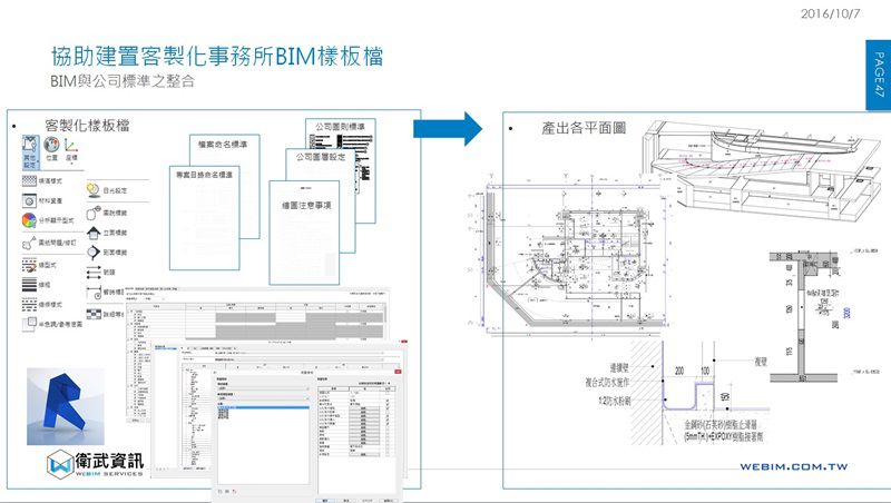 3. 專用元件與樣板檔設定:容易被忽略的一環,或者業主覺得自理就可,但實際上要考慮的細節卻很多,因為工具的轉移,會有很多設定與操作的差異,這邊需要對專業作業流程與 BIM 都有一定的熟悉度才能作的好,因為兩種系統的概念不同,轉移標準是對顧問功力的一個考驗。