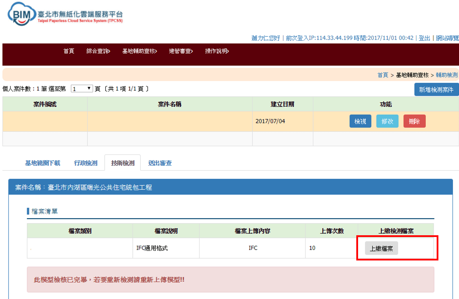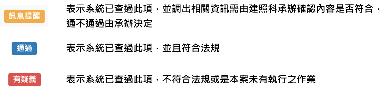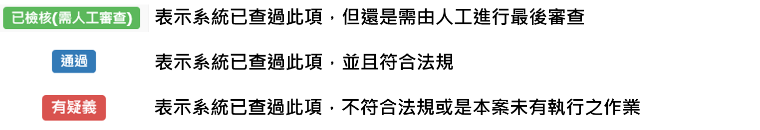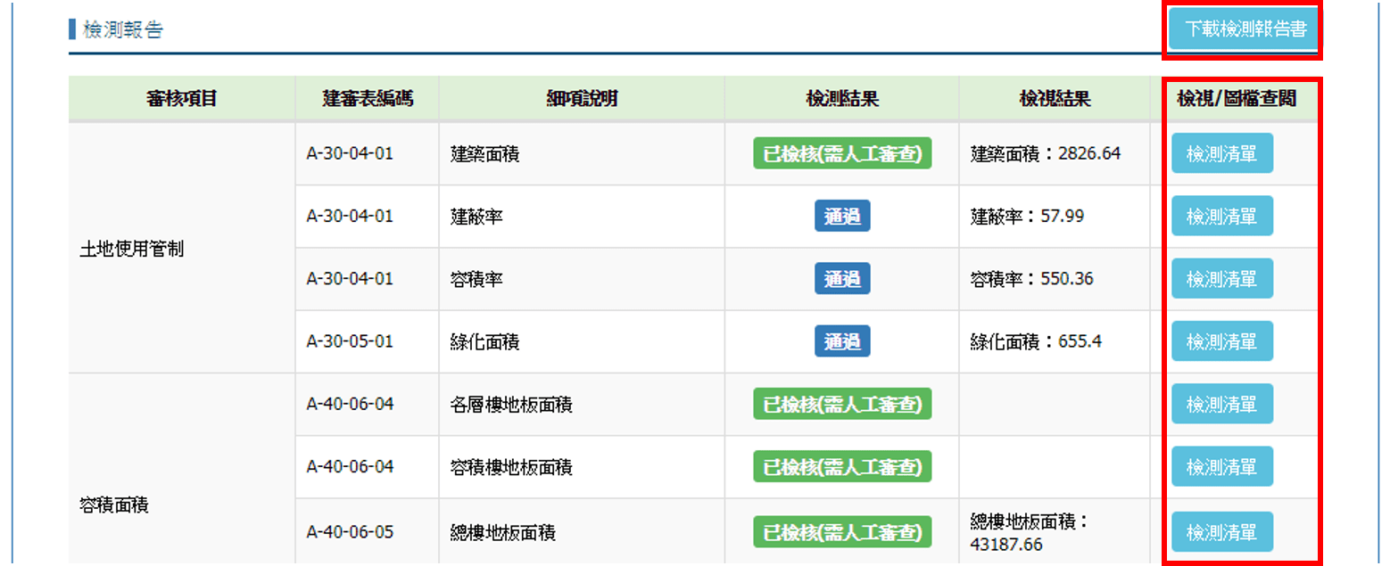 檔案匯出後點選「上傳檔案」即可(如圖 13),通常檢測需要15-30分鐘。技術檢測結果有三種狀態:已檢核(需人工審查)、通過、有疑義(如圖 14)。如果在執行檢測發現有疑義時,在每一項檢測項目後方欄位可以檢視相關圖檔以及檢測結果清單可以確認數值否有問題(如圖 15),同樣的檢測結果不止可以在網路上查看平台也可以將檢測結果轉成PDF檔案。