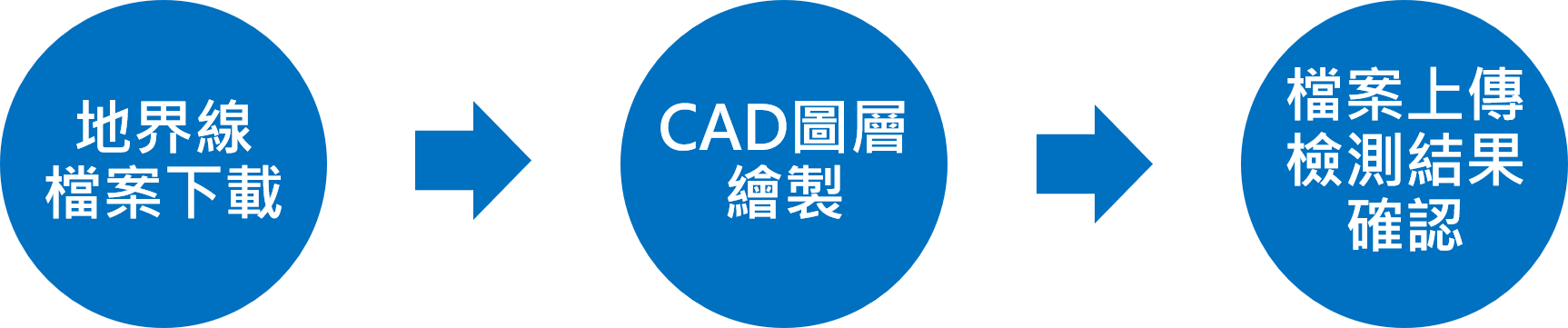 行政檢測作業流程主要分為三個步驟,地界線檔案下載、CAD圖層繪製、檢測檔案上傳並確認檢測結果,後面將說明各階段執行內容。