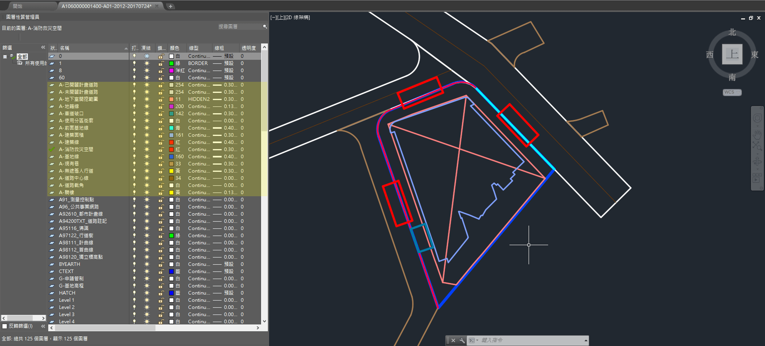 Step2 CAD圖層繪製:打開下載的地界線檔案,我們依據檔案內的圖層要求進行繪置(如圖 3),例如:已開闢道路、未開闢道路、地下室開挖範圍、車道破口、前面基地線、建築線、消防救災空間、現有巷…等等,依據專案資料進行繪置。