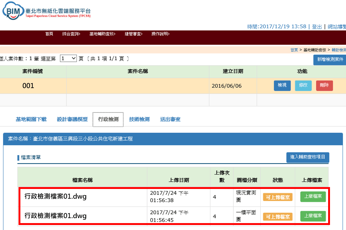 Step3 檔案上傳檢測結果確認:檔案繪製後便可以將檔案上傳,這邊需要上傳兩個檔案(如圖 4)。筆者建議大家在這個步驟可以將現況實測圖與一樓平面圖繪製在同一個檔案,不需要拆分,在上傳時選擇同一個檔案即可,因為系統在檢測時只根據需要的圖層進行檢測,額外的圖層系統是不會檢測的!