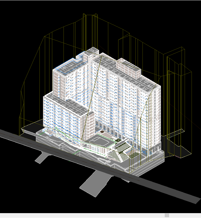 行政檢測報告結果有以下三種狀態(如圖 5):訊息提醒、通過及有疑義。而在檢測結果頁面中如下圖 6,在每一項檢測項目後方欄位可以查閱各項檢測內容資訊,像是平台會依據檢測資料產生建築物消線的CAD檔案,之後也可將CAD檔案匯入到軟體並套繪至BIM模型中(如圖 7)。另外除了在網頁上瀏覽檢測結果,也可以將檢測結果進行下載。