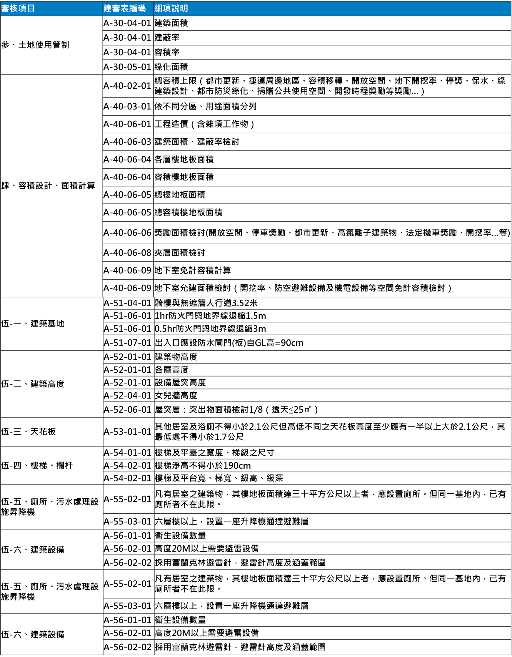 技術檢測的檢測項目內容如下圖 8,目前技術檢測系統使用的法規是以新北市法規為基礎。