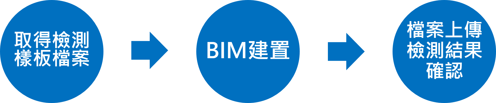 技術檢測執行的流程主要分為三個步驟,取得技術檢測樣板檔案、BIM檢測模型建置、檔案上傳與檢測結果確認,後面將說明各階段執行內容。